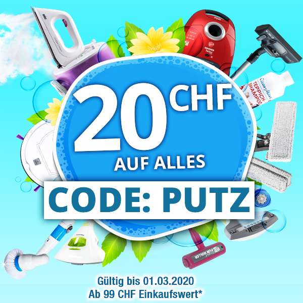 *Gültig nur bis zum 01.03.2020, einmal pro Person einlösbar: 20 CHF-Einkaufsgutschein für alle Artikel im VEDIA Shop www.vedia.ch, inkl. reduzierter Artikel. Barablöse, Kontogutschrift oder eine Kombination mit anderen Aktionen ist nicht möglich. Versand- und Lieferkosten sowie die Versicherungsgebühr sind vom Gutschein ausgeschlossen. Bitte Gutscheincode PUTZ bei der Bestellung eingeben. Der Mindestkaufwert (=Wert der behaltenen Ware und bezahlten Ware) beträgt 99 CHF. Bei Retournierung oder Stornierung aller bestellten Artikel verfällt der Gutschein. Der Gutschein gilt nur für Online-Bestellungen auf www.vedia.ch.