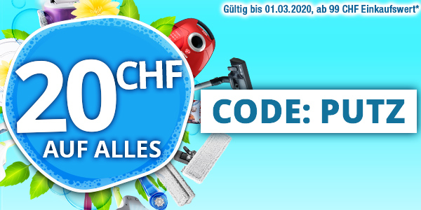 *Gültig nur bis zum 01.03.2020, einmal pro Person einlösbar: 20 CHF-Einkaufsgutschein für alle Artikel im VEDIA Shop www.vedia.ch, inkl. reduzierter Artikel. Barablöse, Kontogutschrift oder eine Kombination mit anderen Aktionen ist nicht möglich. Versand- und Lieferkosten sowie die Versicherungsgebühr sind vom Gutschein ausgeschlossen. Bitte Gutscheincode PUTZ bei der Bestellung eingeben. Der Mindestkaufwert (=Wert der behaltenen Ware und bezahlten Ware) beträgt 99 CHF. Bei Retournierung oder Stornierung aller bestellten Artikel verfällt der Gutschein. Der Gutschein gilt nur für Online-Bestellungen auf www.vedia.ch.