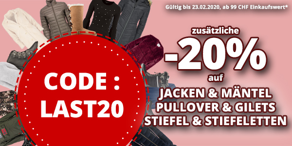 *Gültig bis 23.02.2020, einmal pro Person einlösbar: 20 % Rabatt auf alle Artikel der Rubriken «Jacken & Mäntel», «Pullover & Gilets» und «Stiefel & Stiefeletten», im Bereich Frauen- und Herrenmode, im VEDIA Shop www.vedia.ch, inkl. reduzierter Artikel. Barablöse, Kontogutschrift oder eine Kombination mit anderen Aktionen ist nicht möglich. Versand- und Lieferkosten sowie die Versicherungsgebühr sind vom Rabatt ausgeschlossen. Bitte Rabattcode LAST20 bei der Bestellung eingeben. Der Mindestkaufwert (=Wert der behaltenen Ware und bezahlten Ware) beträgt 99 CHF. Bei Retournierung oder Stornierung aller bestellten Artikel verfällt der Rabatt. Der Rabatt gilt nur für Online-Bestellungen auf www.vedia.ch.