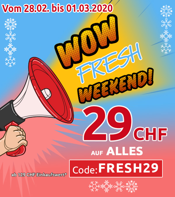 *Gültig nur vom 28.02.2020 bis 01.03.2020, einmal pro Person einlösbar: 29 CHF-Einkaufsgutschein für alle Artikel im VEDIA Shop www.vedia.ch, inkl. reduzierter Artikel. Barablöse, Kontogutschrift oder eine Kombination mit anderen Aktionen ist nicht möglich. Versand- und Lieferkosten sowie die Versicherungsgebühr sind vom Gutschein ausgeschlossen. Bitte Gutscheincode FRESH29 bei der Bestellung eingeben. Der Mindestkaufwert (=Wert der behaltenen Ware und bezahlten Ware) beträgt 129 CHF. Bei Retournierung oder Stornierung aller bestellten Artikel verfällt der Gutschein. Der Gutschein gilt nur für Online-Bestellungen auf www.vedia.ch.