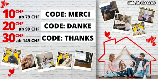 *Gültig bis 26.04.2020, einmal pro Person. Die Einkaufsgutscheine gelten für alle Artikel im VEDIA Shop www.vedia.ch, inkl. reduzierter Artikel. Barablöse, Kontogutschrift oder Kombination mit anderen Aktionen ist nicht möglich. Versand- und Lieferkosten sowie die Versicherungsgebühr sind vom Gutschein ausgeschlossen. Bei der Bestellung geben Sie bitte an: Gutscheincode MERCI für den Gutschein im Wert von 10 CHF, DANKE für den Gutschein im Wert von 20 CHF und THANKS für den Gutschein im Wert von 30 CHF. Die Mindestkaufwerte (=Wert der behaltenen Ware und bezahlten Ware) betragen: 79 CHF für den 10 CHF-Gutschein, 99 CHF für den 20 CHF-Gutschein und 149 CHF für den 30 CHF-Gutschein. Bei Retournierung oder Stornierung aller bestellten Artikel verfallen die Gutscheine. Die Gutscheine gelten nur für Onlinebestellungen auf www.vedia.ch.