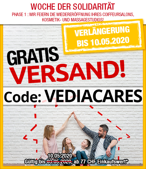 *Nur bis 10.05.2020 versandkostenfrei bestellen: Für die Auslieferung per Post entfällt der Versandkostenanteil von 6.95 CHF pro Bestellung (einmal pro Person einlösbar). Der Gratis-Versand gilt für alle Artikel im VEDIA Shop www.vedia.ch, inkl. reduzierter Artikel. Der Transportzuschlag für sperrige Artikel, Möbel und Grossartikel im Wert von 19.95 CHF, 39.95 CHF bzw. 69.95 CHF ist vom Angebot ausgenommen und wird gegebenenfalls in Rechnung gestellt. Ebenfalls in Rechnung gestellt wird die Versicherungsprämie von 0.90 CHF bei Bestellungen unter 110 CHF, bzw. darüber 0,8 % der Fakturasumme. Der Mindestkaufwert (=Wert der behaltenen Ware und bezahlten Ware) beträgt 77 CHF. Bei Retournierung oder Stornierung aller bestellten Artikel verfällt der Anspruch auf den Gratis-Versand. Der Gratis-Versand gilt nur für Online-Bestellungen auf www.vedia.ch. Bitte Code VEDIACARES bei der Bestellung eingeben.