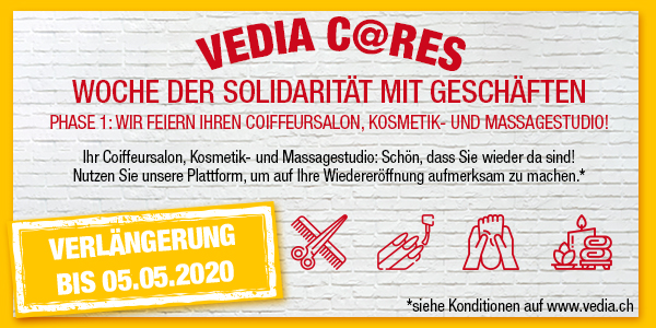 *Nur bis 03.05.2020 versandkostenfrei bestellen: Für die Auslieferung per Post entfällt der Versandkostenanteil von 6.95 CHF pro Bestellung (einmal pro Person einlösbar). Der Gratis-Versand gilt für alle Artikel im VEDIA Shop www.vedia.ch, inkl. reduzierter Artikel. Der Transportzuschlag für sperrige Artikel, Möbel und Grossartikel im Wert von 19.95 CHF, 39.95 CHF bzw. 69.95 CHF ist vom Angebot ausgenommen und wird gegebenenfalls in Rechnung gestellt. Ebenfalls in Rechnung gestellt wird die Versicherungsprämie von 0.90 CHF bei Bestellungen unter 110 CHF, bzw. darüber 0,8 % der Fakturasumme. Der Mindestkaufwert (=Wert der behaltenen Ware und bezahlten Ware) beträgt 77 CHF. Bei Retournierung oder Stornierung aller bestellten Artikel verfällt der Anspruch auf den Gratis-Versand. Der Gratis-Versand gilt nur für Online-Bestellungen auf www.vedia.ch. Bitte Code VEDIACARES bei der Bestellung eingeben.