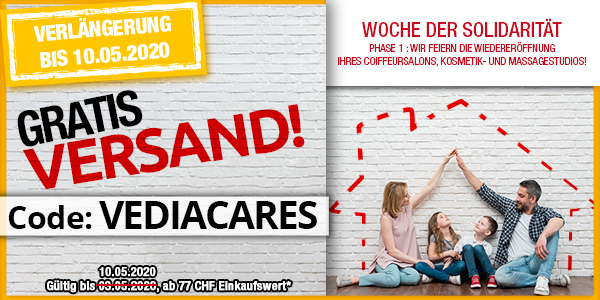 *Nur bis 10.05.2020 versandkostenfrei bestellen: Für die Auslieferung per Post entfällt der Versandkostenanteil von 6.95 CHF pro Bestellung (einmal pro Person einlösbar). Der Gratis-Versand gilt für alle Artikel im VEDIA Shop www.vedia.ch, inkl. reduzierter Artikel. Der Transportzuschlag für sperrige Artikel, Möbel und Grossartikel im Wert von 19.95 CHF, 39.95 CHF bzw. 69.95 CHF ist vom Angebot ausgenommen und wird gegebenenfalls in Rechnung gestellt. Ebenfalls in Rechnung gestellt wird die Versicherungsprämie von 0.90 CHF bei Bestellungen unter 110 CHF, bzw. darüber 0,8 % der Fakturasumme. Der Mindestkaufwert (=Wert der behaltenen Ware und bezahlten Ware) beträgt 77 CHF. Bei Retournierung oder Stornierung aller bestellten Artikel verfällt der Anspruch auf den Gratis-Versand. Der Gratis-Versand gilt nur für Online-Bestellungen auf www.vedia.ch. Bitte Code VEDIACARES bei der Bestellung eingeben.