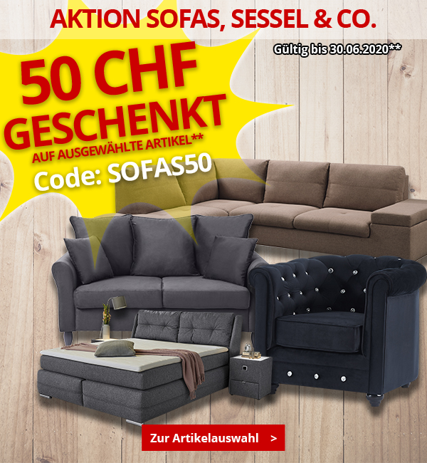 **Gültig bis 30.06.2020, einmal pro Person einlösbar: 50 CHF-Einkaufsgutschein für alle Artikel der Rubrik «Sonderangebot auf Sofas & Sessel» im VEDIA Shop www.vedia.ch/sonderangebot-auf-sofas-sessel/, inkl. reduzierter Artikel. Barablöse, Kontogutschrift oder eine Kombination mit anderen Aktionen ist nicht möglich. Versand- und Lieferkosten sowie die Versicherungsgebühr sind vom Gutschein ausgeschlossen. Bitte Gutscheincode SOFAS50 bei der Bestellung eingeben. Bei Retournierung oder Stornierung aller bestellten Artikel verfällt der Gutschein. Der Gutschein gilt nur für Online-Bestellungen auf www.vedia.ch.