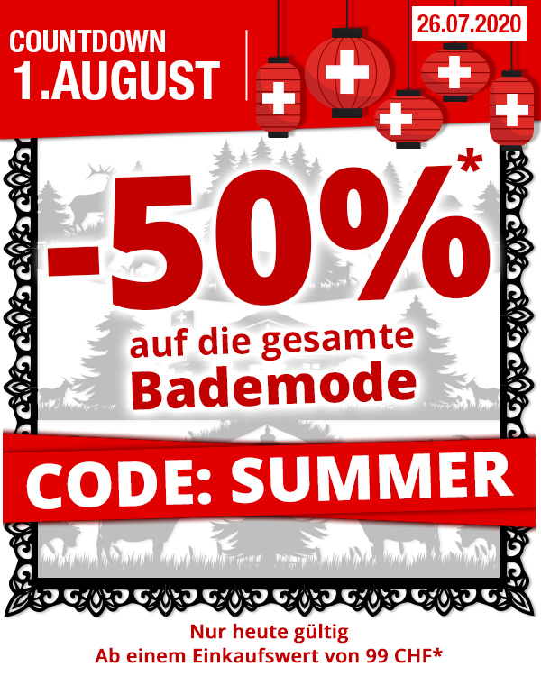 *Nur heute gültig, einmal pro Person einlösbar: 50% Rabatt auf die gesamte «Bademode» im VEDIA Shop www.vedia.ch, inkl. reduzierter Artikel. Barablöse, Kontogutschrift oder eine Kombination mit anderen Aktionen ist nicht möglich. Versand- und Lieferkosten sowie die Versicherungsgebühr sind vom Rabatt ausgeschlossen. Bitte Rabattcode SUMMER bei der Bestellung eingeben. Der Mindestkaufwert (=Wert der behaltenen Ware und bezahlten Ware) beträgt 99 CHF. Bei Retournierung oder Stornierung aller bestellten Artikel verfällt der Rabatt. Der Rabatt gilt nur für Online-Bestellungen auf www.vedia.ch.