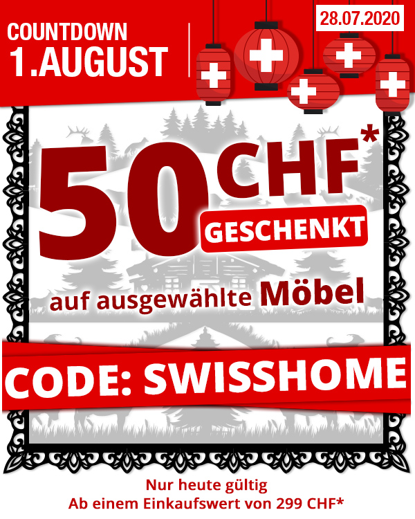 *Nur heute gültig, einmal pro Person, 50 CHF-Einkaufsgutschein für ausgewählte Artikel der Seite «Angebot 28.07.2020 » (https://www.vedia.ch/angebot-gutschein-moebel/) im VEDIA Shop www.vedia.ch, Versandkostenanteil von 6.95 CHF entfällt. Transportzuschlag für grosse Artikel, sperrige Artikel, Möbel und Grossartikel (19.95 CHF, 39.95 CHF bzw. 69.95 CHF) sowie die Versicherungsgebühr sind vom Angebot ausgeschlossen. Barablöse, Kontogutschrift oder Kombination mit anderen Aktionen ist nicht möglich. Bei Retournierung oder Stornierung aller bestellten Artikel verfällt der Anspruch. Angebot gilt nur für Onlinebestellungen auf www.vedia.ch. Der Mindestkaufwert (=Wert der behaltenen Ware und bezahlten Ware) beträgt 299 CHF. Bitte Code SWISSHOME bei der Bestellung eingeben.