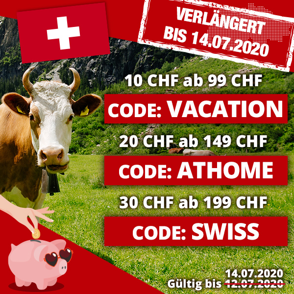 *Gültig nur bis  zum 14.07.2020, einmal pro Person. Die Einkaufsgutscheine gelten für alle Artikel im VEDIA Shop www.vedia.ch, inkl. reduzierter Artikel. Barablöse, Kontogutschrift oder Kombination mit anderen Aktionen ist nicht möglich. Versand- und Lieferkosten sowie die Versicherungsgebühr sind vom Gutschein ausgeschlossen. Bei der Bestellung geben Sie bitte an: Gutscheincode VACATION für den Gutschein im Wert von 10 CHF, ATHOME für den Gutschein im Wert von 20 CHF und INSUISS für den Gutschein im Wert von 30 CHF. Die Mindestkaufwerte (=Wert der behaltenen Ware und bezahlten Ware) betragen: 99 CHF für den 10 CHF-Gutschein, 149 CHF für den 20 CHF-Gutschein und 199 CHF für den 30 CHF-Gutschein. Bei Retournierung oder Stornierung aller bestellten Artikel verfallen die Gutscheine. Die Gutscheine gelten nur für Onlinebestellungen auf www.vedia.ch.