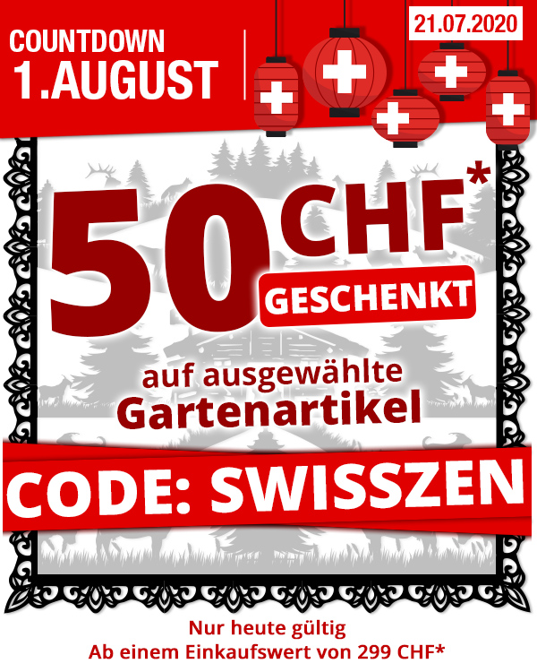 *Nur heute gültig, einmal pro Person, 50 CHF-Einkaufsgutschein auf ausgewählte Artikel der Seite «Angebot 21.07.2020 » (https://www.vedia.ch/angebot-gartenmoebel-sets/) im VEDIA Shop www.vedia.ch, Versandkostenanteil von 6.95 CHF entfällt. Transportzuschlag für grosse Artikel, sperrige Artikel, Möbel und Grossartikel (19.95 CHF, 39.95 CHF bzw. 69.95 CHF) sowie die Versicherungsgebühr sind vom Angebot ausgeschlossen. Barablöse, Kontogutschrift oder Kombination mit anderen Aktionen ist nicht möglich. Bei Retournierung oder Stornierung aller bestellten Artikel verfällt der Anspruch. Angebot gilt nur für Onlinebestellungen auf www.vedia.ch. Der Mindestkaufwert (=Wert der behaltenen Ware und bezahlten Ware) beträgt 299 CHF. Bitte Code SIWSSZEN bei der Bestellung eingeben.