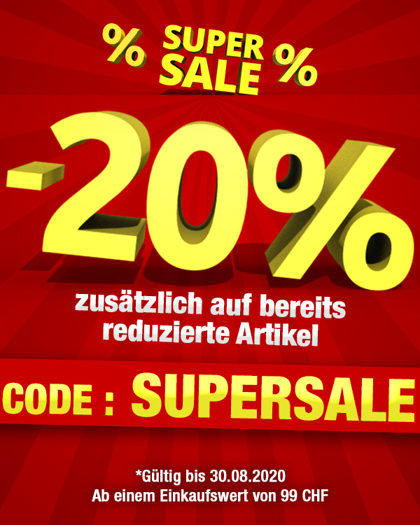 *Gültig nur bis zum 30.08.2020, einmal pro Person einlösbar: 20 % Rabatt auf alle Artikel der Rubrik «Sale» im VEDIA Shop www.vedia.ch, inkl. reduzierter Artikel. Barablöse, Kontogutschrift oder eine Kombination mit anderen Aktionen ist nicht möglich. Versand- und Lieferkosten sowie die Versicherungsgebühr sind vom Rabatt ausgeschlossen. Bitte Rabattcode SUPERSALE bei der Bestellung eingeben. Der Mindestkaufwert (=Wert der behaltenen Ware und bezahlten Ware) beträgt 99 CHF. Bei Retournierung oder Stornierung aller bestellten Artikel verfällt der Rabatt. Der Rabatt gilt nur für Online-Bestellungen auf www.vedia.ch.