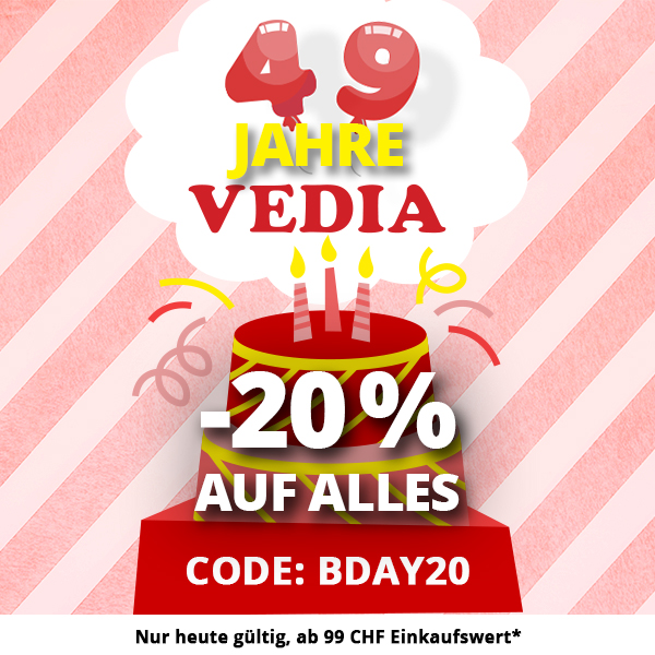 *Gültig nur am 10.08.2020, einmal pro Person einlösbar: 20 % Rabatt auf alle Artikel im VEDIA Shop www.vedia.ch, inkl. reduzierter Artikel. Barablöse, Kontogutschrift oder eine Kombination mit anderen Aktionen ist nicht möglich. Versand- und Lieferkosten sowie die Versicherungsgebühr sind vom Rabatt ausgeschlossen. Bitte Rabattcode BDAY20 bei der Bestellung eingeben. Der Mindestkaufwert (=Wert der behaltenen Ware und bezahlten Ware) beträgt 99 CHF. Bei Retournierung oder Stornierung aller bestellten Artikel verfällt der Rabatt. Der Rabatt gilt nur für Online-Bestellungen auf www.vedia.ch.