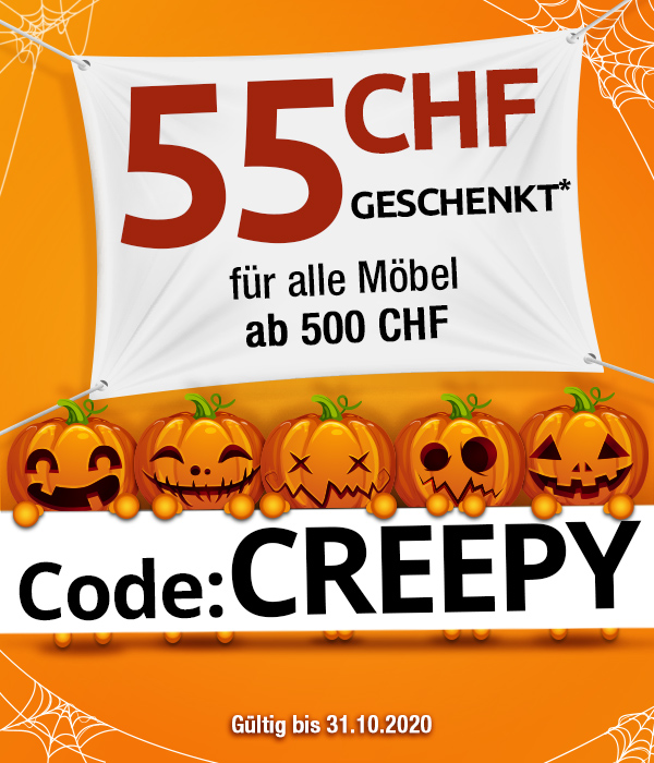 *Gültig am 31.10.2020, einmal pro Person einlösbar: 55 CHF-Einkaufsgutschein für alle Artikel der Seite «https://www.vedia.ch/moebel-aktion-halloween/» im VEDIA Shop www.vedia.ch, inkl. reduzierter Artikel. Barablöse, Kontogutschrift oder eine Kombination mit anderen Aktionen ist nicht möglich. Versand- und Lieferkosten sowie die Versicherungsgebühr sind vom Gutschein ausgeschlossen. Bitte Gutscheincode CREEPY bei der Bestellung eingeben. Der Mindestkaufwert (=Wert der behaltenen Ware und bezahlten Ware) beträgt 500 CHF. Bei Retournierung oder Stornierung aller bestellten Artikel verfällt der Gutschein. Der Gutschein gilt nur für Online-Bestellungen auf www.vedia.ch.