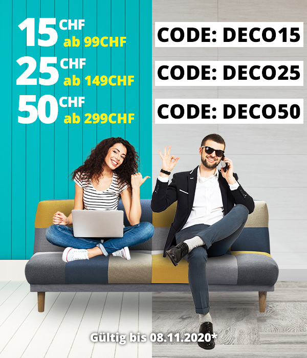 *Gültig bis zum 08.11.2020, einmal pro Person. Die Einkaufsgutscheine gelten für alle Artikel im VEDIA Shop www.vedia.ch, inkl. reduzierter Artikel. Barablöse, Kontogutschrift oder Kombination mit anderen Aktionen ist nicht möglich. Versand- und Lieferkosten sowie die Versicherungsgebühr sind vom Gutschein ausgeschlossen. Bei der Bestellung geben Sie bitte an: Gutscheincode DECO15 für den Gutschein im Wert von 15 CHF, DECO25 für den Gutschein im Wert von 25 CHF und DECO50 für den Gutschein im Wert von 50 CHF. Die Mindestkaufwerte (=Wert der behaltenen Ware und bezahlten Ware) betragen: 99 CHF für den 15 CHF-Gutschein, 149 CHF für den 25 CHF-Gutschein und 299 CHF für den 50 CHF-Gutschein. Bei Retournierung oder Stornierung aller bestellten Artikel verfallen die Gutscheine. Die Gutscheine gelten nur für Onlinebestellungen auf www.vedia.ch.