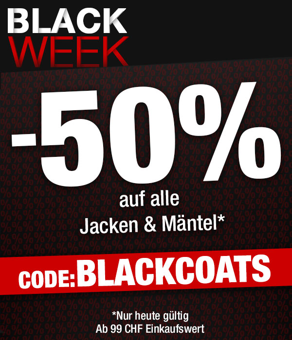 *Gültig nur am 26.11.2020, einmal pro Person einlösbar: 50% Rabatt auf alle Artikel der Rubrik «Jacken & Mäntel» im VEDIA Shop www.vedia.ch, inkl. reduzierter Artikel. Barablöse, Kontogutschrift oder eine Kombination mit anderen Aktionen ist nicht möglich. Versand- und Lieferkosten sowie die Versicherungsgebühr sind vom Rabatt ausgeschlossen. Bitte Rabattcode BLACKCOATS bei der Bestellung eingeben. Der Mindestkaufwert (=Wert der behaltenen Ware und bezahlten Ware) beträgt 99 CHF. Bei Retournierung oder Stornierung aller bestellten Artikel verfällt der Rabatt. Der Rabatt gilt nur für Online-Bestellungen auf www.vedia.ch.