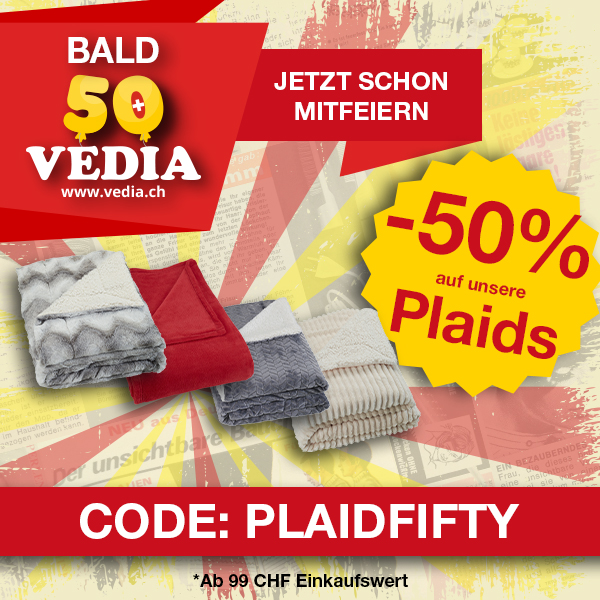 *Gültig nur am 29.12.2020, einmal pro Person einlösbar: 50 % Rabatt auf unsere Plaids im VEDIA Shop www.vedia.ch, inkl. reduzierter Artikel. Barablöse, Kontogutschrift oder eine Kombination mit anderen Aktionen ist nicht möglich. Versand- und Lieferkosten sowie die Versicherungsgebühr sind vom Rabatt ausgeschlossen. Bitte Rabattcode PLAIDFIFTY bei der Bestellung eingeben. Der Mindestkaufwert (=Wert der behaltenen Ware und bezahlten Ware) beträgt 99 CHF. Bei Retournierung oder Stornierung aller bestellten Artikel verfällt der Rabatt. Der Rabatt gilt nur für Online-Bestellungen auf www.vedia.ch.