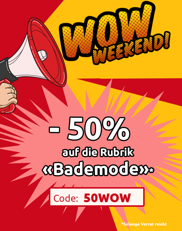 *Gültig nur vom 26.02.2021 bis 28.02.2021, einmal pro Person einlösbar: 50 % Rabatt auf alle Artikel der Rubrik «Bikinis und Badeanzuege» im VEDIA Shop www.vedia.ch, inkl. reduzierter Artikel. Barablöse, Kontogutschrift oder eine Kombination mit anderen Aktionen ist nicht möglich. Versand- und Lieferkosten sowie die Versicherungsgebühr sind vom Rabatt ausgeschlossen. Bitte Rabattcode 50WOW bei der Bestellung eingeben. Der Mindestkaufwert (=Wert der behaltenen Ware und bezahlten Ware) beträgt 99 CHF. Bei Retournierung oder Stornierung aller bestellten Artikel verfällt der Rabatt. Der Rabatt gilt nur für Online-Bestellungen auf www.vedia.ch.