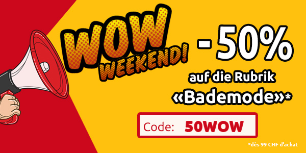 *Gültig nur vom 26.02.2021 bis 28.02.2021, einmal pro Person einlösbar: 50 % Rabatt auf alle Artikel der Rubrik «Bikinis und Badeanzuege» im VEDIA Shop www.vedia.ch, inkl. reduzierter Artikel. Barablöse, Kontogutschrift oder eine Kombination mit anderen Aktionen ist nicht möglich. Versand- und Lieferkosten sowie die Versicherungsgebühr sind vom Rabatt ausgeschlossen. Bitte Rabattcode 50WOW bei der Bestellung eingeben. Der Mindestkaufwert (=Wert der behaltenen Ware und bezahlten Ware) beträgt 99 CHF. Bei Retournierung oder Stornierung aller bestellten Artikel verfällt der Rabatt. Der Rabatt gilt nur für Online-Bestellungen auf www.vedia.ch.