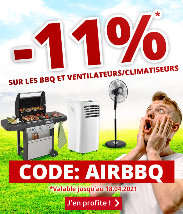 *Valable uniquement jusqu'au 18.04.2021, une seule fois pour une seule personne : rabais de 11% sur tous les articles des rubriques «Grillades & barbecue» et «Ventilateurs & climatiseurs» de la boutique en ligne VEDIA www.vedia.ch, y compris sur les articles à prix réduits. Le montant ne peut être remboursé en liquide, ni crédité sur un compte, ni cumulé avec d'autres actions. Le rabais n’est pas valable sur les frais de port, de livraison et d’assurance. Merci d'indiquer le code du rabais AIRBBQ lors de la commande. Le rabais n'est valable que pour les commandes passées par Internet sur www.vedia.ch.