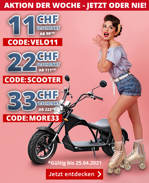 *Gültig bis 25.04.2021, einmal pro Person. Die Einkaufsgutscheine gelten für alle Artikel im VEDIA Shop www.vedia.ch, inkl. reduzierter Artikel. Versandkostenanteil von 6.95 CHF entfällt. Transportzuschlag für grosse Artikel, sperrige Artikel, Möbel und Grossartikel (19.95 CHF, 39.95 CHF bzw. 69.95 CHF) sowie die Versicherungsgebühr sind vom Angebot ausgeschlossen. Barablöse, Kontogutschrift oder Kombination mit anderen Aktionen ist nicht möglich. Bei der Bestellung geben Sie bitte an: Gutscheincode VELO11 für den Gutschein im Wert von 11 CHF, SCOOTER für den Gutschein im Wert von 22 CHF und MORE33 für den Gutschein im Wert von 33 CHF. Die Mindestkaufwerte (=Wert der behaltenen Ware und bezahlten Ware) betragen: 88 CHF für den 11 CHF-Gutschein, 111 CHF für den 22 CHF-Gutschein und 222 CHF für den 33 CHF-Gutschein. Bei Retournierung oder Stornierung aller bestellten Artikel verfallen die Gutscheine. Die Gutscheine gelten nur für Onlinebestellungen auf www.vedia.ch.