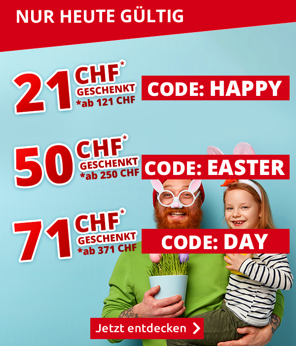 *Nur heute gültig,, einmal pro Person. Die Einkaufsgutscheine gelten für alle Artikel im VEDIA Shop www.vedia.ch, inkl. reduzierter Artikel. Versandkostenanteil von 6.95 CHF entfällt. Transportzuschlag für grosse Artikel, sperrige Artikel, Möbel und Grossartikel (19.95 CHF, 39.95 CHF bzw. 69.95 CHF) sowie die Versicherungsgebühr sind vom Angebot ausgeschlossen. Barablöse, Kontogutschrift oder Kombination mit anderen Aktionen ist nicht möglich. Bei der Bestellung geben Sie bitte an: Gutscheincode HAPPY für den Gutschein im Wert von 21 CHF, EASTER für den Gutschein im Wert von 50 CHF und  DAY für den Gutschein im Wert von 71 CHF. Die Mindestkaufwerte (=Wert der behaltenen Ware und bezahlten Ware) betragen: 121 CHF für den 21 CHF-Gutschein, 250 CHF für den 50 CHF-Gutschein und 371 CHF für den 71 CHF-Gutschein. Bei Retournierung oder Stornierung aller bestellten Artikel verfallen die Gutscheine. Die Gutscheine gelten nur für Onlinebestellungen auf www.vedia.ch.