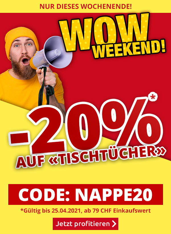 *Gültig bis 25.04.2021, einmal pro Person einlösbar: 20 % Rabatt auf alle Artikel der Rubrik «Tischtücher» im VEDIA Shop www.vedia.ch, inkl. reduzierter Artikel. Barablöse, Kontogutschrift oder eine Kombination mit anderen Aktionen ist nicht möglich. Versand- und Lieferkosten sowie die Versicherungsgebühr sind vom Rabatt ausgeschlossen. Bitte Rabattcode NAPPE20 bei der Bestellung eingeben. Der Mindestkaufwert (=Wert der behaltenen Ware und bezahlten Ware) beträgt 79 CHF. Bei Retournierung oder Stornierung aller bestellten Artikel verfällt der Rabatt. Der Rabatt gilt nur für Online-Bestellungen auf www.vedia.ch.