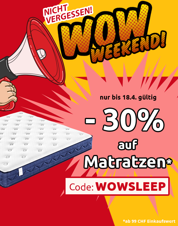 *Gültig nur vom 16.04.2021 bis 18.04.2021, einmal pro Person einlösbar: 30 % Rabatt auf alle Artikel der Rubrik «Matratzen und Bettrahmen» im VEDIA Shop www.vedia.ch, inkl. reduzierter Artikel. Barablöse, Kontogutschrift oder eine Kombination mit anderen Aktionen ist nicht möglich. Versand- und Lieferkosten sowie die Versicherungsgebühr sind vom Rabatt ausgeschlossen. Bitte Rabattcode WOWSLEEP bei der Bestellung eingeben. Der Mindestkaufwert (=Wert der behaltenen Ware und bezahlten Ware) beträgt 99 CHF. Bei Retournierung oder Stornierung aller bestellten Artikel verfällt der Rabatt. Der Rabatt gilt nur für Online-Bestellungen auf www.vedia.ch.