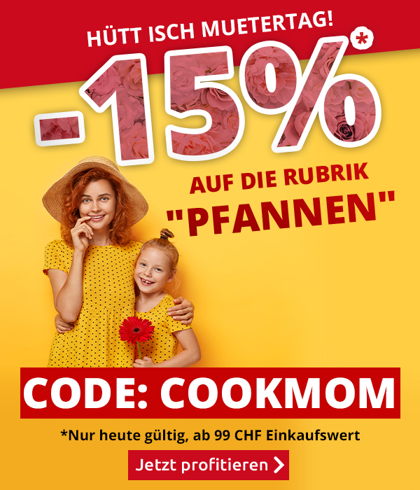 *Nur heute gültig, einmal pro Person einlösbar: 15% Rabatt auf alle Artikel der Rubrik «Pfannen & Bratpfannen» im VEDIA Shop www.vedia.ch, inkl. reduzierter Artikel. Barablöse, Kontogutschrift oder eine Kombination mit anderen Aktionen ist nicht möglich. Versand- und Lieferkosten sowie die Versicherungsgebühr sind vom Rabatt ausgeschlossen. Bitte Rabattcode COOKMOM bei der Bestellung eingeben. Der Mindestkaufwert (=Wert der behaltenen Ware und bezahlten Ware) beträgt 99 CHF. Bei Retournierung oder Stornierung aller bestellten Artikel verfällt der Rabatt. Der Rabatt gilt nur für Online-Bestellungen auf www.vedia.ch.
