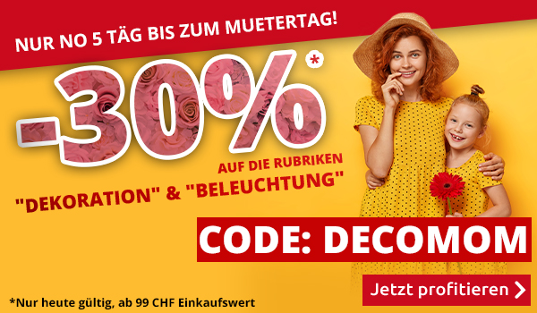 *Nur heute gültig, einmal pro Person einlösbar: 30% Rabatt auf alle Artikel die Rubriken «Dekoration» und «Beleuchtung» im VEDIA Shop www.vedia.ch, inkl. reduzierter Artikel. Barablöse, Kontogutschrift oder eine Kombination mit anderen Aktionen ist nicht möglich. Versand- und Lieferkosten sowie die Versicherungsgebühr sind vom Rabatt ausgeschlossen. Bitte Rabattcode DECOMOM bei der Bestellung eingeben. Der Mindestkaufwert (=Wert der behaltenen Ware und bezahlten Ware) beträgt 99 CHF. Bei Retournierung oder Stornierung aller bestellten Artikel verfällt der Rabatt. Der Rabatt gilt nur für Online-Bestellungen auf www.vedia.ch.