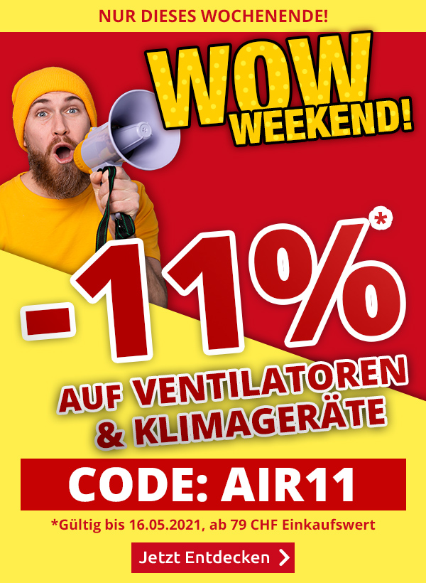*Gültig nur vom 14.05.2021 bis 16.05.2021, einmal pro Person einlösbar: 20 % Rabatt auf alle Artikel der Rubrik «Ventilatoren & Klimageräte» im VEDIA Shop www.vedia.ch, inkl. reduzierter Artikel. Barablöse, Kontogutschrift oder eine Kombination mit anderen Aktionen ist nicht möglich. Versand- und Lieferkosten sowie die Versicherungsgebühr sind vom Rabatt ausgeschlossen. Bitte Rabattcode AIR11 bei der Bestellung eingeben. Der Mindestkaufwert (=Wert der behaltenen Ware und bezahlten Ware) beträgt 79 CHF. Bei Retournierung oder Stornierung aller bestellten Artikel verfällt der Rabatt. Der Rabatt gilt nur für Online-Bestellungen auf www.vedia.ch.