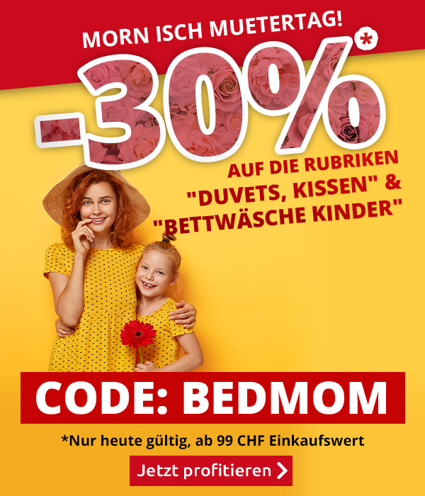 *Nur heute gültig, einmal pro Person einlösbar: 30% Rabatt auf alle Artikel die Rubriken «Duvets, Kissen & Matratzenschutz» und «Bettwäsche Kinder & Jugend» im VEDIA Shop www.vedia.ch, inkl. reduzierter Artikel. Barablöse, Kontogutschrift oder eine Kombination mit anderen Aktionen ist nicht möglich. Versand- und Lieferkosten sowie die Versicherungsgebühr sind vom Rabatt ausgeschlossen. Bitte Rabattcode BEDMOM bei der Bestellung eingeben. Der Mindestkaufwert (=Wert der behaltenen Ware und bezahlten Ware) beträgt 99 CHF. Bei Retournierung oder Stornierung aller bestellten Artikel verfällt der Rabatt. Der Rabatt gilt nur für Online-Bestellungen auf www.vedia.ch.