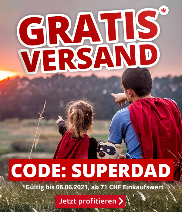 *Nur bis 06.06.2021, versandkostenfrei bestellen: Für die Auslieferung per Post entfällt der Versandkostenanteil von 6.95 CHF pro Bestellung (einmal pro Person einlösbar). Der Gratis-Versand gilt für alle Artikel im VEDIA Shop www.vedia.ch, inkl. reduzierter Artikel. Der Transportzuschlag für sperrige Artikel, Möbel und Grossartikel im Wert von 19.95 CHF, 39.95 CHF bzw. 69.95 CHF ist vom Angebot ausgenommen und wird gegebenenfalls in Rechnung gestellt. Ebenfalls in Rechnung gestellt wird die Versicherungsprämie von 0.90 CHF bei Bestellungen unter 110 CHF, bzw. darüber 0,8 % der Fakturasumme. Der Mindestkaufwert (=Wert der behaltenen Ware und bezahlten Ware) beträgt 71 CHF. Bei Retournierung oder Stornierung aller bestellten Artikel verfällt der Anspruch auf den Gratis-Versand. Der Gratis-Versand gilt nur für Online-Bestellungen auf www.vedia.ch. Bitte Code SUPERDAD bei der Bestellung eingeben.
