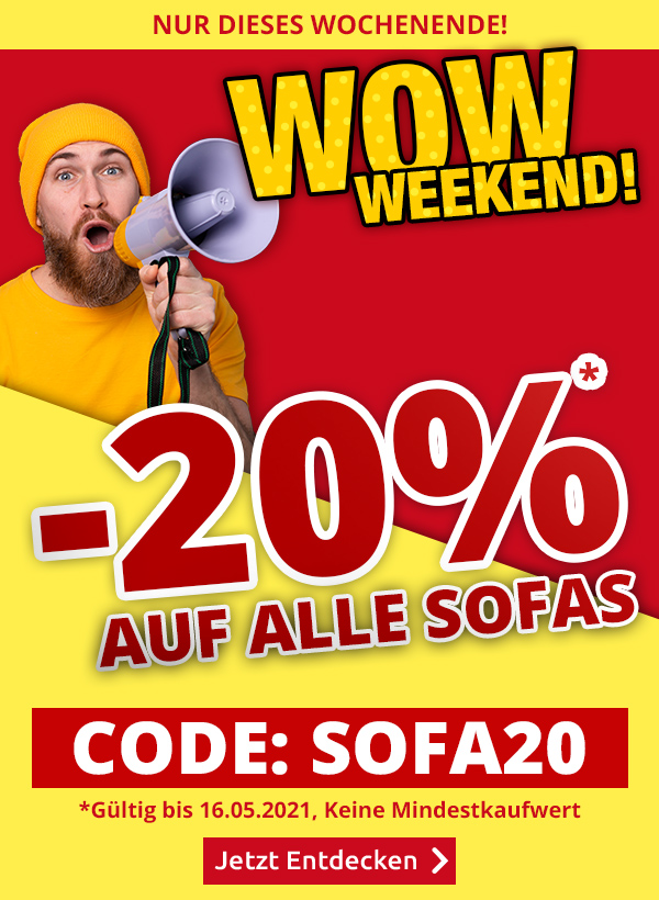 *Gültig nur vom 14.05.2021 bis 16.05.2021, einmal pro Person einlösbar: 20 % Rabatt auf alle Artikel der Rubrik «Sofas» im VEDIA Shop www.vedia.ch, inkl. reduzierter Artikel. Barablöse, Kontogutschrift oder eine Kombination mit anderen Aktionen ist nicht möglich. Versand- und Lieferkosten sowie die Versicherungsgebühr sind vom Rabatt ausgeschlossen. Bitte Rabattcode SOFA20 bei der Bestellung eingeben. Keine Mindestkaufwert. Bei Retournierung oder Stornierung aller bestellten Artikel verfällt der Rabatt. Der Rabatt gilt nur für Online-Bestellungen auf www.vedia.ch.