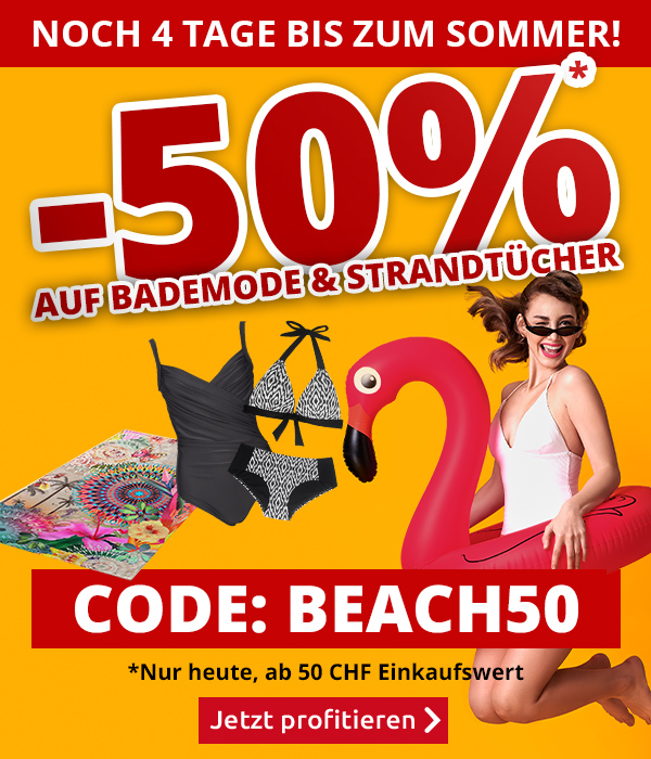 *Nur heute gültig, einmal pro Person einlösbar: 50 % Rabatt auf alle Artikel der Rubrik «Bademode» im VEDIA Shop www.vedia.ch, inkl. reduzierter Artikel. Barablöse, Kontogutschrift oder eine Kombination mit anderen Aktionen ist nicht möglich. Versand- und Lieferkosten sowie die Versicherungsgebühr sind vom Rabatt ausgeschlossen. Bitte Rabattcode BEACH50 bei der Bestellung eingeben. Der Mindestkaufwert (=Wert der behaltenen Ware und bezahlten Ware) beträgt 50 CHF. Bei Retournierung oder Stornierung aller bestellten Artikel verfällt der Rabatt. Der Rabatt gilt nur für Online-Bestellungen auf www.vedia.ch.