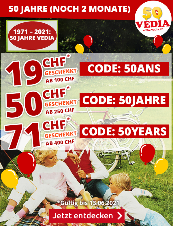 *Gültig bis 13.06.2021, einmal pro Person. Die Einkaufsgutscheine gelten für alle Artikel im VEDIA Shop www.vedia.ch, inkl. reduzierter Artikel. Barablöse, Kontogutschrift oder Kombination mit anderen Aktionen ist nicht möglich. Versand- und Lieferkosten sowie die Versicherungsgebühr sind vom Gutschein ausgeschlossen. Bei der Bestellung geben Sie bitte an: Gutscheincode 50ANS für den Gutschein im Wert von 19 CHF, 50JAHRE für den Gutschein im Wert von 50 CHF und 50YEARS für den Gutschein im Wert von 71 CHF. Die Mindestkaufwerte (=Wert der behaltenen Ware und bezahlten Ware) betragen: 100 CHF für den 19 CHF-Gutschein, 250 CHF für den 25 CHF-Gutschein und 400 CHF für den 50 CHF-Gutschein. Bei Retournierung oder Stornierung aller bestellten Artikel verfallen die Gutscheine. Die Gutscheine gelten nur für Onlinebestellungen auf www.vedia.ch.