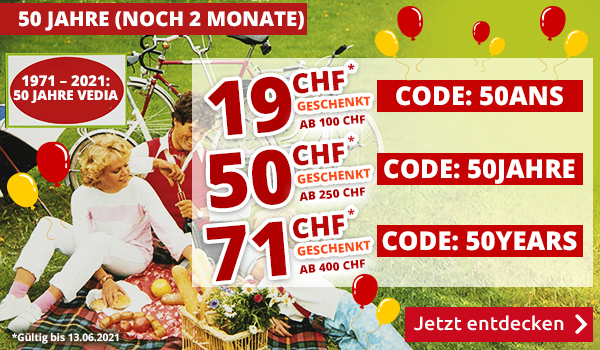*Gültig bis 13.06.2021, einmal pro Person. Die Einkaufsgutscheine gelten für alle Artikel im VEDIA Shop www.vedia.ch, inkl. reduzierter Artikel. Barablöse, Kontogutschrift oder Kombination mit anderen Aktionen ist nicht möglich. Versand- und Lieferkosten sowie die Versicherungsgebühr sind vom Gutschein ausgeschlossen. Bei der Bestellung geben Sie bitte an: Gutscheincode 50ANS für den Gutschein im Wert von 19 CHF, 50JAHRE für den Gutschein im Wert von 50 CHF und 50YEARS für den Gutschein im Wert von 71 CHF. Die Mindestkaufwerte (=Wert der behaltenen Ware und bezahlten Ware) betragen: 100 CHF für den 19 CHF-Gutschein, 250 CHF für den 25 CHF-Gutschein und 400 CHF für den 50 CHF-Gutschein. Bei Retournierung oder Stornierung aller bestellten Artikel verfallen die Gutscheine. Die Gutscheine gelten nur für Onlinebestellungen auf www.vedia.ch.