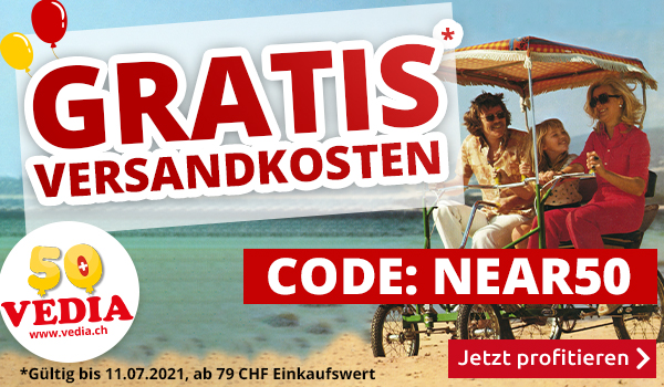 *Nur bis 11.07.2021 versandkostenfrei bestellen: Für die Auslieferung per Post entfällt der Versandkostenanteil von CHF 6.95 pro Bestellung (einmal pro Person einlösbar). Der Gratis-Versand gilt für alle Artikel im VEDIA Shop www.vedia.ch, inkl. reduzierter Artikel. Die Transportzuschläge für Möbel und andere Speditions-Artikel im Wert von CHF 19.95, CHF 49.95, CHF 99  bzw. CHF 129 sind vom Angebot ausgenommen und werden gegebenenfalls in Rechnung gestellt. Ebenfalls in Rechnung gestellt wird die Versicherungsprämie von CHF 0.90 bei Bestellungen unter CHF 110, bzw. darüber 0,8 % der Fakturasumme. Der Mindestkaufwert (=Wert der behaltenen Ware und bezahlten Ware) beträgt CHF 100. Bei Retournierung oder Stornierung aller bestellten Artikel verfällt der Anspruch auf den Gratis-Versand. Der Gratis-Versand gilt nur für Online-Bestellungen auf www.vedia.ch. Bitte Code NEAR50 bei der Bestellung eingeben.