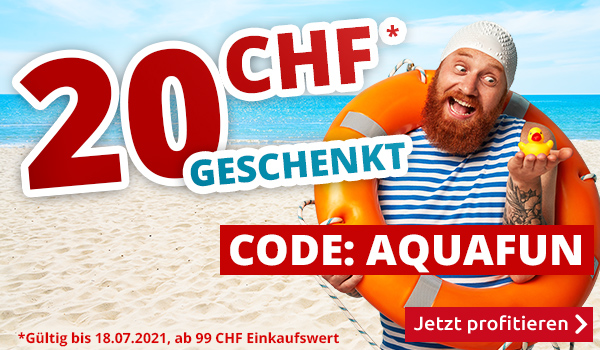 *Gültig am 18.07.2021, einmal pro Person einlösbar: 20 CHF-Einkaufsgutschein für alle Artikel im VEDIA Shop www.vedia.ch, inkl. reduzierter Artikel. Barablöse, Kontogutschrift oder eine Kombination mit anderen Aktionen ist nicht möglich. Versandkosten und Transportzuschläge sowie die Versicherungsgebühr sind vom Gutschein ausgeschlossen. Bitte Gutscheincode AQUAFUN bei der Bestellung eingeben. Der Mindestkaufwert (=Wert der behaltenen Ware und bezahlten Ware) beträgt CHF 99. Bei Retournierung oder Stornierung aller bestellten Artikel verfällt der Gutschein. Der Gutschein gilt nur für Online-Bestellungen auf www.vedia.ch.