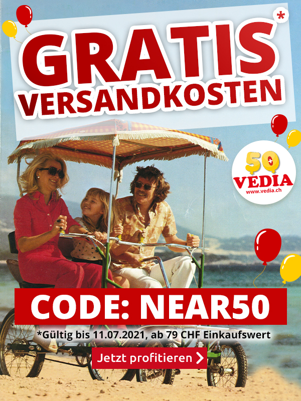 *Nur bis 11.07.2021 versandkostenfrei bestellen: Für die Auslieferung per Post entfällt der Versandkostenanteil von CHF 6.95 pro Bestellung (einmal pro Person einlösbar). Der Gratis-Versand gilt für alle Artikel im VEDIA Shop www.vedia.ch, inkl. reduzierter Artikel. Die Transportzuschläge für Möbel und andere Speditions-Artikel im Wert von CHF 19.95, CHF 49.95, CHF 99 bzw. CHF 129 sind vom Angebot ausgenommen und werden gegebenenfalls in Rechnung gestellt. Ebenfalls in Rechnung gestellt wird die Versicherungsprämie von CHF 0.90 bei Bestellungen unter CHF 110, bzw. darüber 0,8 % der Fakturasumme. Der Mindestkaufwert (=Wert der behaltenen Ware und bezahlten Ware) beträgt CHF 100. Bei Retournierung oder Stornierung aller bestellten Artikel verfällt der Anspruch auf den Gratis-Versand. Der Gratis-Versand gilt nur für Online-Bestellungen auf www.vedia.ch. Bitte Code NEAR50 bei der Bestellung eingeben.