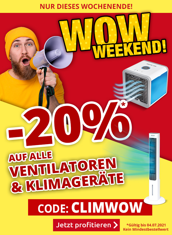 *Gültig nur vom 02.07.2021 bis 04.07.2021, einmal pro Person einlösbar: 20 % Rabatt auf alle Artikel der Rubrik «klimageraete & ventilatoren» im VEDIA Shop www.vedia.ch, inkl. reduzierter Artikel. Barablöse, Kontogutschrift oder eine Kombination mit anderen Aktionen ist nicht möglich. Versandkosten und Transportzuschläge sowie die Versicherungsgebühr sind vom Rabatt ausgeschlossen. Bitte Rabattcode CLIMWOW bei der Bestellung eingeben. Kein Mindestbestellwert. Bei Retournierung oder Stornierung aller bestellten Artikel verfällt der Rabatt. Der Rabatt gilt nur für Online-Bestellungen auf www.vedia.ch.