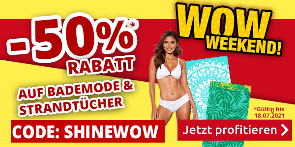 *Gültig nur vom 16.07.2021 bis 184.07.2021, einmal pro Person einlösbar: 50 % Rabatt auf alle Artikel der Rubrik «Bademode und Strandtücher» im VEDIA Shop www.vedia.ch, inkl. reduzierter Artikel. Barablöse, Kontogutschrift oder eine Kombination mit anderen Aktionen ist nicht möglich. Versandkosten und Transportzuschläge sowie die Versicherungsgebühr sind vom Rabatt ausgeschlossen. Bitte Rabattcode SHINEWOW bei der Bestellung eingeben. Kein Mindestbestellwert. Bei Retournierung oder Stornierung aller bestellten Artikel verfällt der Rabatt. Der Rabatt gilt nur für Online-Bestellungen auf www.vedia.ch.