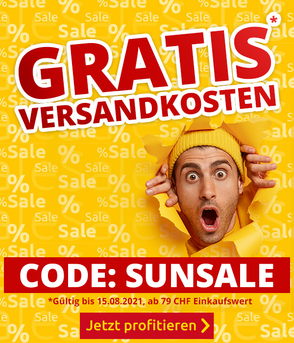 *Gültig nur bis zum 15.08.2021: Für die Auslieferung per Post entfällt der Versandkostenanteil von 6.95 CHF pro Bestellung (einmal pro Person einlösbar). Der Gratis-Versand gilt für alle Artikel im VEDIA Shop www.vedia.ch, inkl. reduzierter Artikel. Die Transportzuschläge für Möbel und andere Speditions-Artikel im Wert von 19.95 CHF, 49.95 CHF, 99 CHF bzw. 129 CHF sind vom Angebot ausgenommen und werden gegebenenfalls in Rechnung gestellt. Ebenfalls in Rechnung gestellt wird die Versicherungsprämie von 0.90 CHF bei Bestellungen unter 110 CHF, bzw. 0,8 % der Fakturasumma bei Bestellungen über 110 CHF. Der Mindestkaufwert (= Wert der behaltenen Ware und bezahlten Ware) beträgt 79 CHF. Bei Retournierung oder Stornierung aller bestellter Artikel verfällt der Anspruch auf den Gratis-Versand. Der Gratis-Versand gilt nur für Online-Bestellungen auf www.vedia.ch. Bitte Code SUNSALE bei der Bestellung angeben.