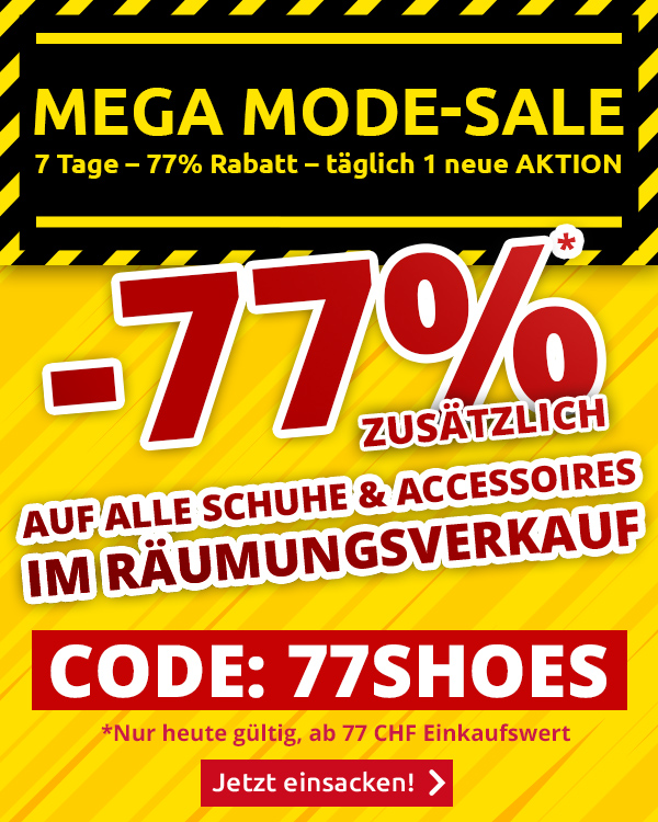 *Nur heute gültig, einmal pro Person einlösbar: 77 % Rabatt zusätzlich auf den ausgezeichneten Verkaufspreis auf alle Schuhe und Accessoires der Rubrik «Räumungsverkauf» (www.vedia.ch/mode-sale-77-rabatt-auf-schuhe-accessoires/) im VEDIA Shop www.vedia.ch. Barablöse, Kontogutschrift oder eine Kombination mit anderen Aktionen ist nicht möglich. Versandkosten und Transportzuschläge sowie die Versicherungsgebühr sind vom Rabatt ausgeschlossen. Bitte Rabattcode 77SHOES bei der Bestellung eingeben. Der Mindestkaufwert (=Wert der behaltenen Ware und bezahlten Ware) beträgt CHF 77. Bei Retournierung oder Stornierung aller bestellten Artikel verfällt der Rabatt. Der Rabatt gilt nur für Online-Bestellungen auf www.vedia.ch.