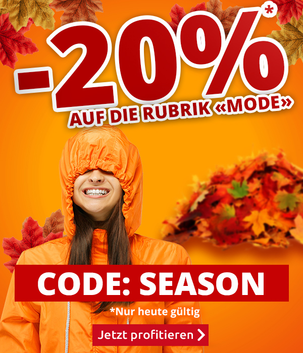 *Nur heute gültig, einmal pro Person einlösbar: 20% Rabatt auf alle Artikel der Rubrik «Mode» im VEDIA Shop www.vedia.ch, inkl. reduzierter Artikel. Barablöse, Kontogutschrift oder eine Kombination mit anderen Aktionen ist nicht möglich. Versandkosten und Transportzuschläge sowie die Versicherungsgebühr sind vom Rabatt ausgeschlossen. Bitte Rabattcode SEASON bei der Bestellung eingeben. Bei Retournierung oder Stornierung aller bestellten Artikel verfällt der Rabatt. Der Rabatt gilt nur für Online-Bestellungen auf www.vedia.ch.