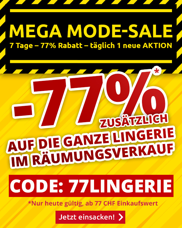 *Nur heute gültig, einmal pro Person einlösbar: 77 % Rabatt zusätzlich auf den ausgezeichneten Verkaufspreis auf die ganze Lingerie der Rubrik «Räumungsverkauf» (www.vedia.ch/mode-sale-77-rabatt-auf-lingerie/) im VEDIA Shop www.vedia.ch. Barablöse, Kontogutschrift oder eine Kombination mit anderen Aktionen ist nicht möglich. Versandkosten und Transportzuschläge sowie die Versicherungsgebühr sind vom Rabatt ausgeschlossen. Bitte Rabattcode 77LINGERIE bei der Bestellung eingeben. Der Mindestkaufwert (=Wert der behaltenen Ware und bezahlten Ware) beträgt CHF 77. Bei Retournierung oder Stornierung aller bestellten Artikel verfällt der Rabatt. Der Rabatt gilt nur für Online-Bestellungen auf www.vedia.ch.