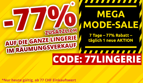 *Nur heute gültig, einmal pro Person einlösbar: 77 % Rabatt zusätzlich auf den ausgezeichneten Verkaufspreis auf die ganze Lingerie der Rubrik «Räumungsverkauf» (www.vedia.ch/mode-sale-77-rabatt-auf-lingerie/) im VEDIA Shop www.vedia.ch. Barablöse, Kontogutschrift oder eine Kombination mit anderen Aktionen ist nicht möglich. Versandkosten und Transportzuschläge sowie die Versicherungsgebühr sind vom Rabatt ausgeschlossen. Bitte Rabattcode 77LINGERIE bei der Bestellung eingeben. Der Mindestkaufwert (=Wert der behaltenen Ware und bezahlten Ware) beträgt CHF 77. Bei Retournierung oder Stornierung aller bestellten Artikel verfällt der Rabatt. Der Rabatt gilt nur für Online-Bestellungen auf www.vedia.ch.