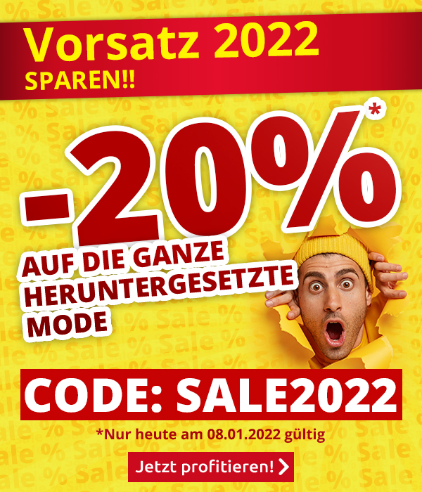 *Nur heute gültig am 08.01.2022, einmal pro Person einlösbar: 20 % Rabatt auf alle Artikel der Rubrik «Räumungsverkauf Mode» im VEDIA Shop www.vedia.ch, inkl. reduzierter Artikel. Barablöse, Kontogutschrift oder eine Kombination mit anderen Aktionen ist nicht möglich. Versandkosten und Transportzuschläge sowie die Versicherungsgebühr sind vom Rabatt ausgeschlossen. Bitte Rabattcode SALE2022 bei der Bestellung eingeben. Bei Retournierung oder Stornierung aller bestellten Artikel verfällt der Rabatt. Der Rabatt gilt nur für Online-Bestellungen auf www.vedia.ch.