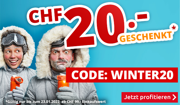 *Gültig nur bis zum 23.01.2022, einmal pro Person einlösbar: CHF 20.- Einkaufsgutschein für alle Artikel im VEDIA Shop www.vedia.ch, inkl. reduzierter Artikel. Barablöse, Kontogutschrift oder eine Kombination mit anderen Aktionen ist nicht möglich. Versandkosten und Transportzuschläge sowie die Versicherungsgebühr sind vom Gutschein ausgeschlossen. Bitte Gutscheincode WINTER20 bei der Bestellung eingeben. Der Mindestkaufwert (=Wert der behaltenen Ware und bezahlten Ware) beträgt CHF 99.-. Bei Retournierung oder Stornierung aller bestellten Artikel verfällt der Gutschein. Der Gutschein gilt nur für Online-Bestellungen auf www.vedia.ch.