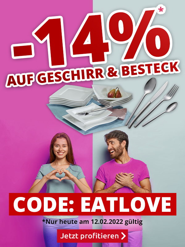 *Gültig nur am 12.02.2022, einmal pro Person einlösbar: 14% Rabatt auf alle Artikel der Rubrik «Geschirr & Besteck» im VEDIA Shop www.vedia.ch, inkl. reduzierter Artikel. Barablöse, Kontogutschrift oder eine Kombination mit anderen Aktionen ist nicht möglich. Versandkosten und Transportzuschläge sowie die Versicherungsgebühr sind vom Rabatt ausgeschlossen. Bitte Rabattcode EATLOVE bei der Bestellung eingeben. Bei Retournierung oder Stornierung aller bestellten Artikel verfällt der Rabatt. Der Rabatt gilt nur für Online-Bestellungen auf www.vedia.ch.