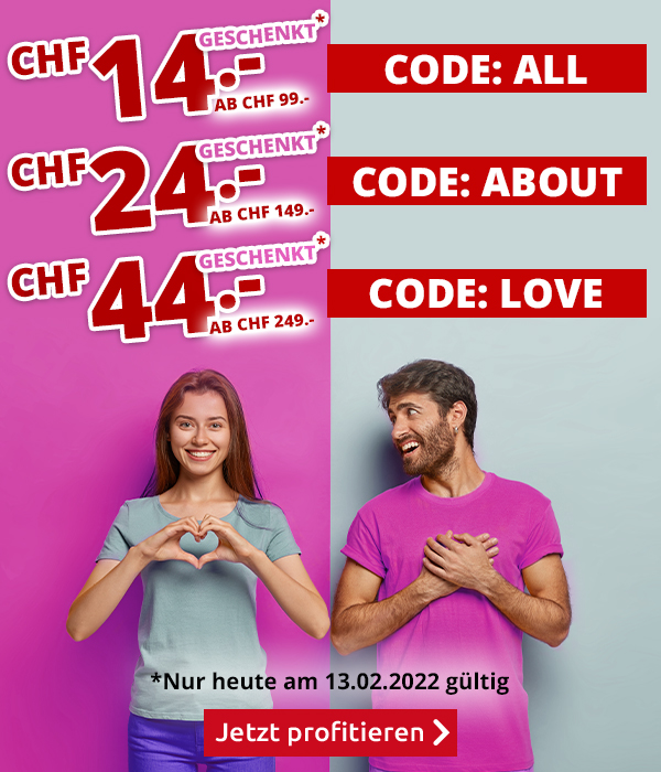 *Gültig nur am 13.02.2022, einmal pro Person. Die Einkaufsgutscheine gelten für alle Artikel im VEDIA Shop www.vedia.ch, inkl. reduzierter Artikel. Barablöse, Kontogutschrift oder Kombination mit anderen Aktionen ist nicht möglich. Versandkosten und Transportzuschläge sowie die Versicherungsgebühr sind vom Gutschein ausgeschlossen. Bei der Bestellung geben Sie bitte an: Gutscheincode ALL für den Gutschein im Wert von CHF 14, ABOUT für den Gutschein im Wert von CHF 24 und LOVE für den Gutschein im Wert von CHF 44. Die Mindestkaufwerte (=Wert der behaltenen Ware und bezahlten Ware) betragen: CHF 99 für den CHF 14-Gutschein, CHF 149 für den CHF 24-Gutschein und CHF 249 für den CHF 44-Gutschein. Bei Retournierung oder Stornierung aller bestellten Artikel verfallen die Gutscheine. Die Gutscheine gelten nur für Onlinebestellungen auf www.vedia.ch.