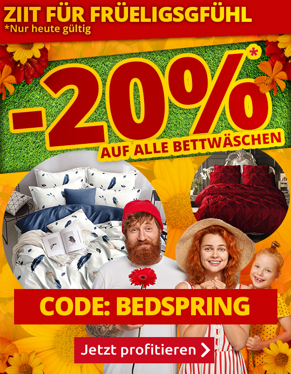 *Gültig nur am 23.02.2022, einmal pro Person einlösbar: 20% Rabatt auf alle Artikel der Rubrik «Bettwäsche» im VEDIA Shop www.vedia.ch, inkl. reduzierter Artikel. Barablöse, Kontogutschrift oder eine Kombination mit anderen Aktionen ist nicht möglich. Versandkosten und Transportzuschläge sowie die Versicherungsgebühr sind vom Rabatt ausgeschlossen. Bitte Rabattcode BEDSPRING bei der Bestellung eingeben. Bei Retournierung oder Stornierung aller bestellten Artikel verfällt der Rabatt. Der Rabatt gilt nur für Online-Bestellungen auf www.vedia.ch.
